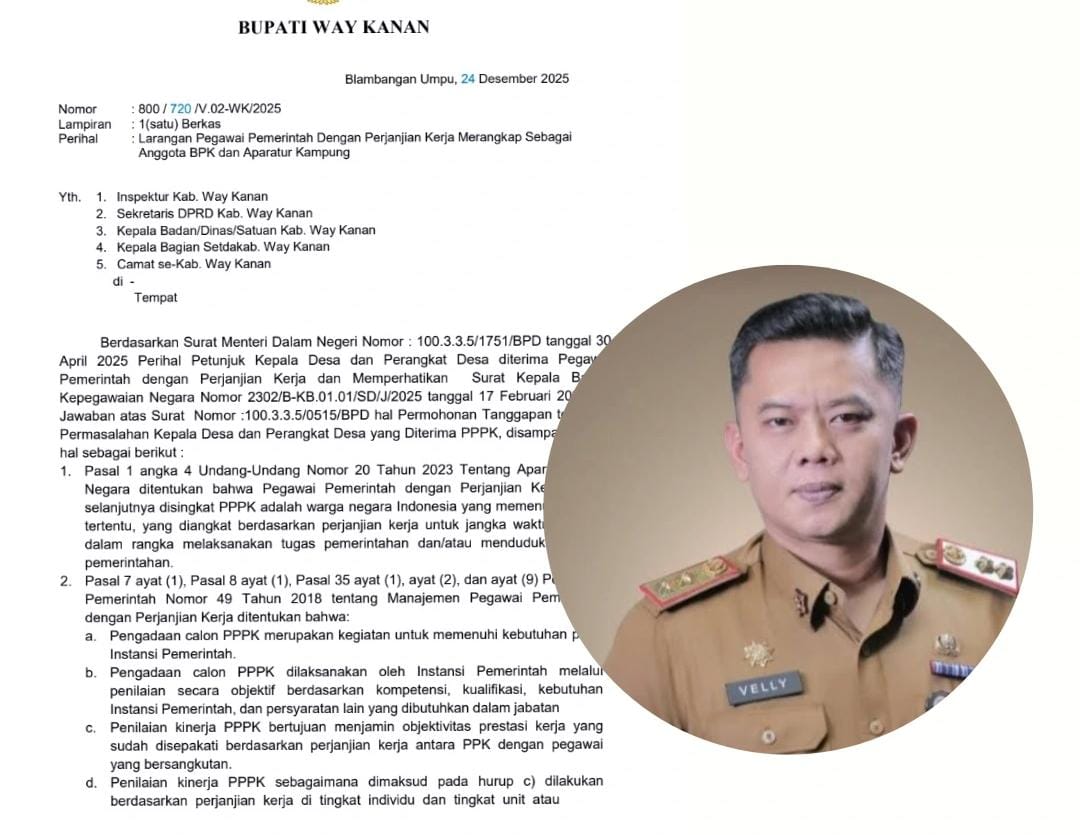 PENGABARAN.ID – Bupati Way Kanan resmi mengeluarkan surat edaran yang melarang Pegawai Pemerintah dengan Perjanjian Kerja (PPPK) Paruh Waktu merangkap jabatan sebagai Anggota Badan Permusyawaratan Kampung (BPK) maupun sebagai aparatur kampung. Kebijakan ini tertuang dalam Surat Bupati Way Kanan Nomor 800/720/V.02-WK/2025 tertanggal 24 Desember 2025.