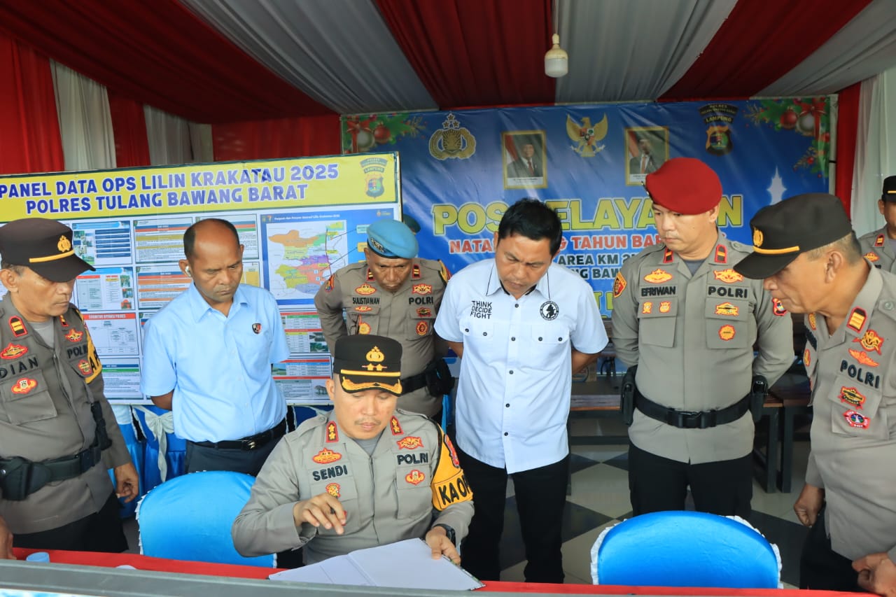 PENGABARAN.ID – Guna memastikan kesiapan pengamanan Ops lilin Krakatau 2025, Kapolres Tulang Bawang Barat (Tubaba), Polda Lampung AKBP Sendi Antoni.S.I.K, M.I.K, bersama Ibu Ketua Bhayangkari Cabang Tubaba Ny. Nina Sendi Antoni, didampingi para Pejabat Utama (PJU ) Polres Tubaba melakukan kunjungan ke Pos Yan Rest Area 215 Trans Tol Trans Sumatera Way Kenanga, Rabu (24/12/25) Siang.