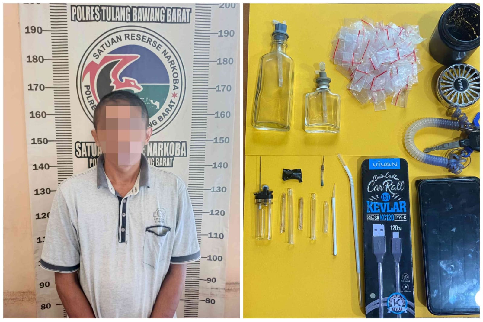 Lebih lanjut terang AKP Samsi, saat dilakukan penggerebekan dan penggeledahan, dari tersangka berhasil diamankan 1 (satu) plastik klip kecil berisi diduga narkotika jenis shabu yang dilapisi lakban berwarna hitam seberat 0,34 Gram, 5 (lima) buah tabung kaca pirek, 2 (dua) buah alat hisap (bong), 1 (satu) buah korek api gas yang terpasang 1 (satu) buah jarum, 1 (satu) buah sumbu pembakar, 1 (satu) buah sumbu pembakar, 1 (satu) buah sendok shabu, 1 (satu) buah selang pipet, 1 (satu) buah wadah kaleng merk vivan, 1 (satu) buah wadah kaca yang didalamnya berisi 87 klip kecil kosong bekas pakai, 1 (satu) unit handphone vivo y 1902 warna hitam dan 1 (satu) unit sepeda motor merk honda revo.